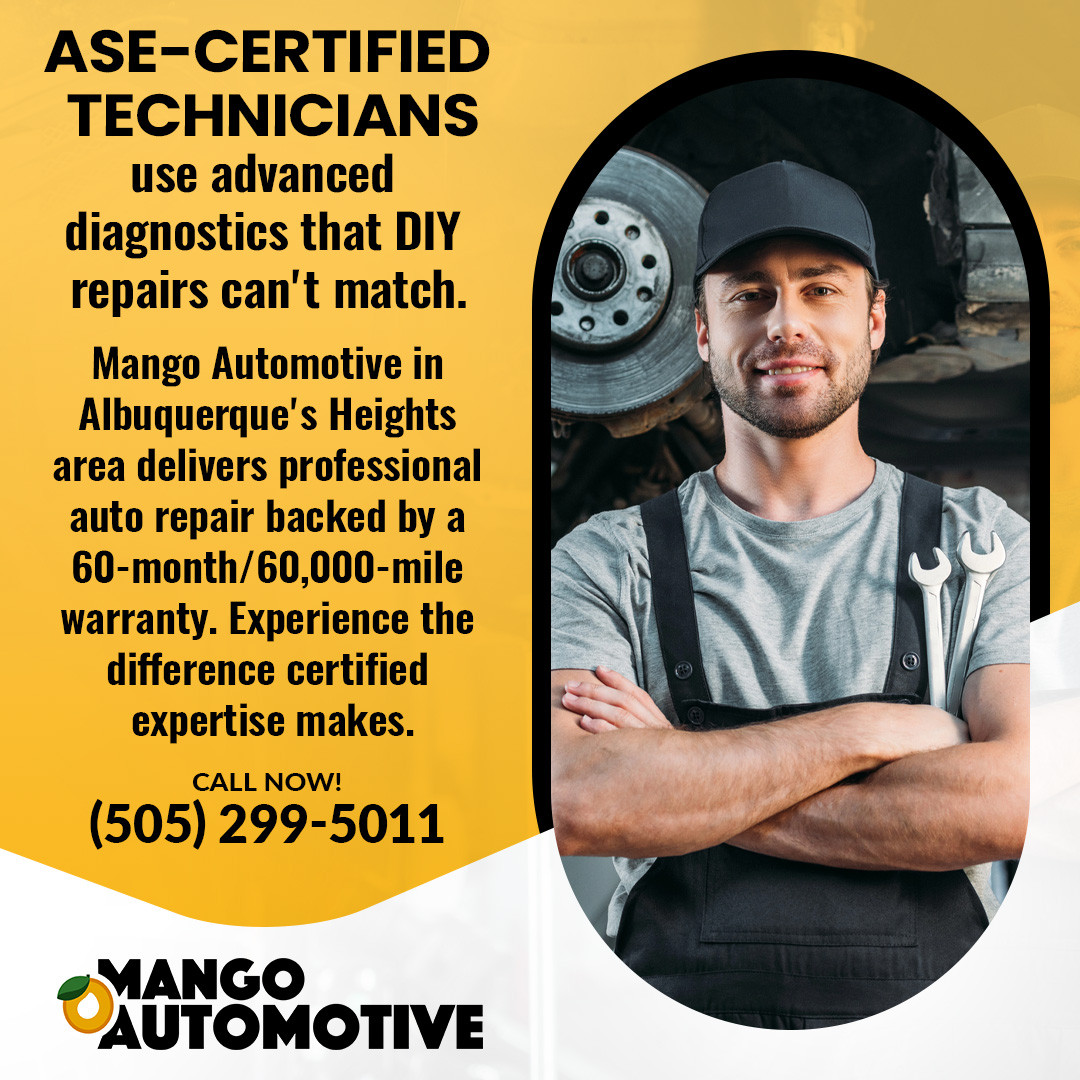 Albuquerque, NM - Mango Automotive today presents a compelling case for why drivers in Albuquerque should choose professional auto repair over DIY or informal options. Combining certified technicians, advanced diagnostic tools, clear communication, and an industry‑leading warranty, Mango Automotive distinguishes itself among auto repair shops in the region, especially for vehicle owners seeking reliable and accountable auto repair at the Heights in Albuquerque.
