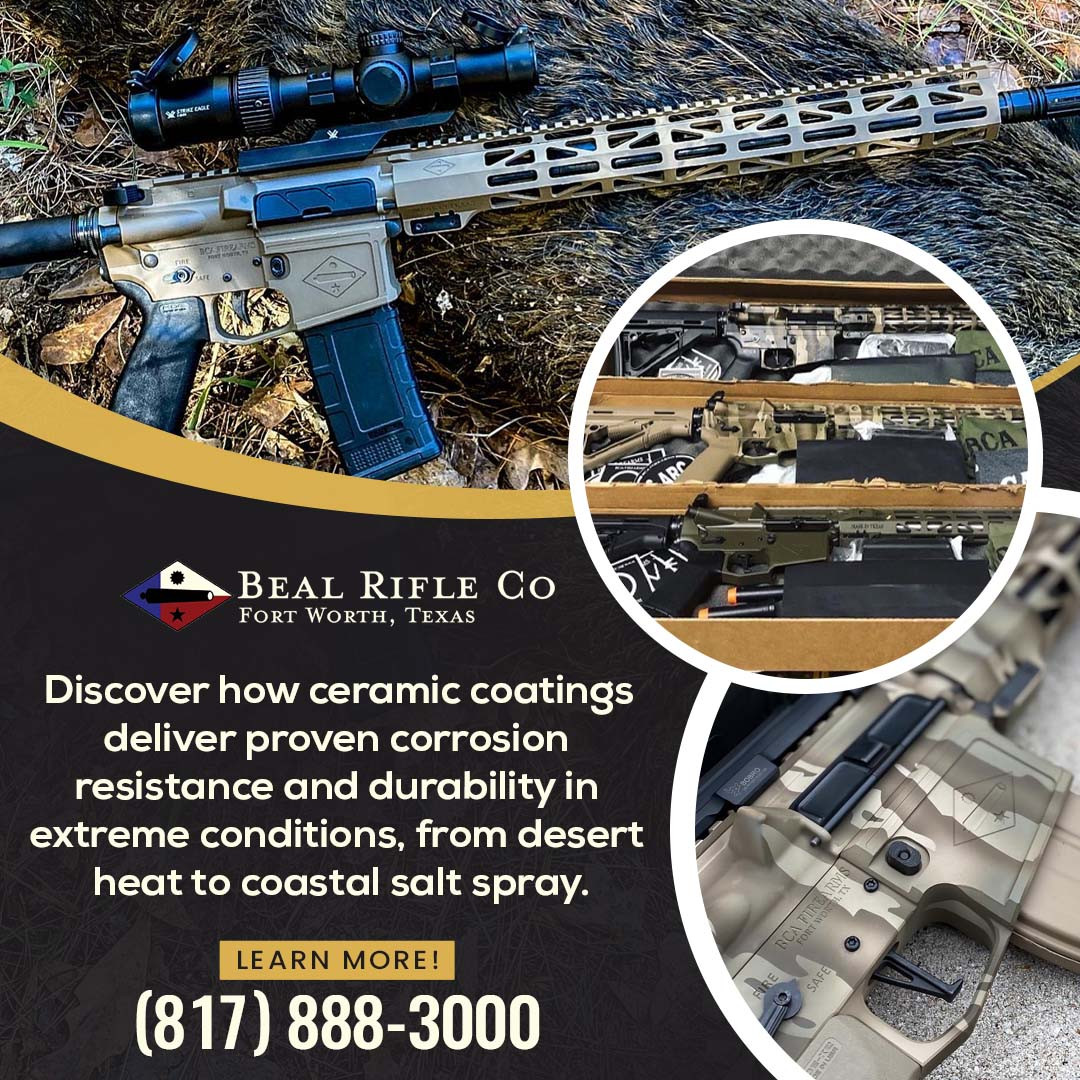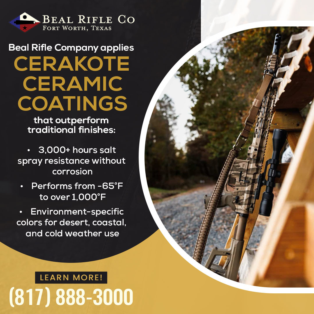 Shooters researching where to buy an AR-15 in Fort Worth, TX, can contact Beal Rifle Company at (817) 888-3000 or info@bealrifleco.com to discuss Cerakote color options and complete build specifications. The team guides customers through component selection, finish choices, and delivery timelines.