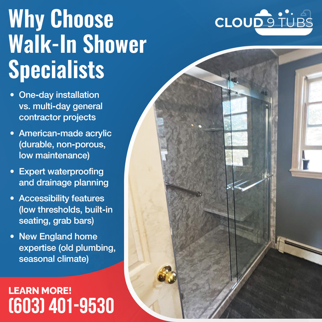 Free in-home consultations are available by appointment, and estimates remain valid for a full year, giving families time to plan their upgrade without sales pressure. To schedule a consultation for your Derry walk-in shower installation, call (603) 401-9530 or email info@cloud9tubs.com.