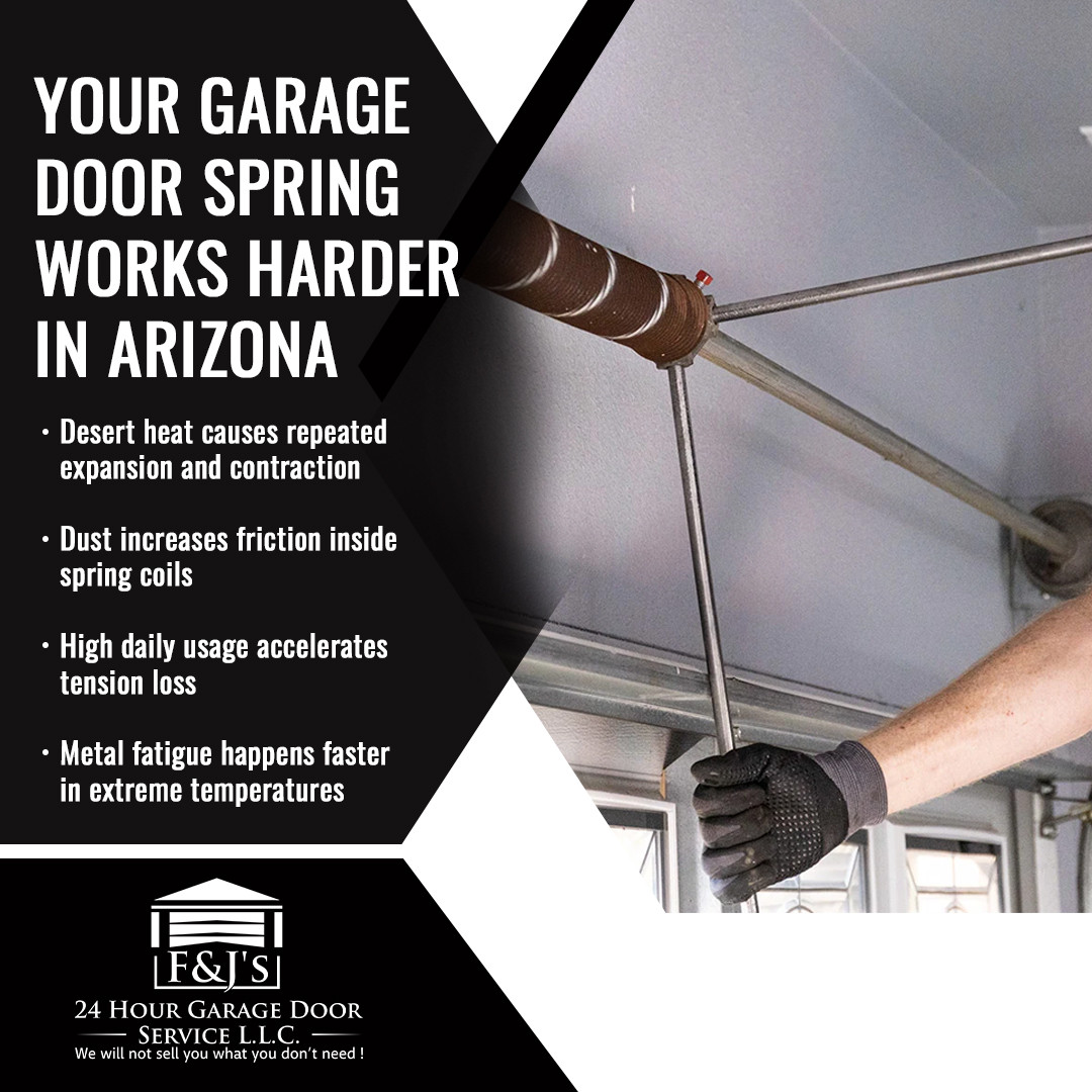 Garage door systems in Arizona face conditions that accelerate spring wear. Heat, dust, and frequent usage combine to shorten the working life of springs across the region.