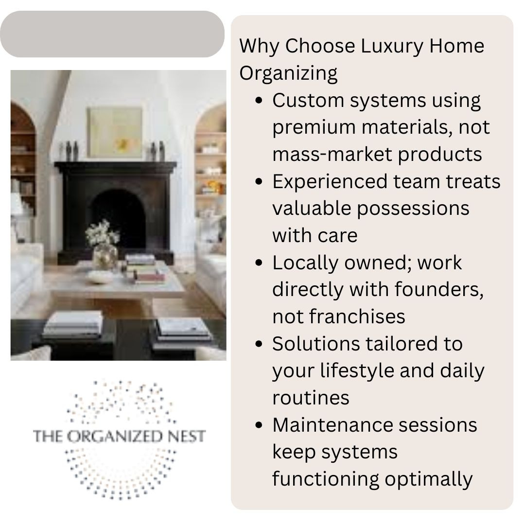 The professional home organizer team at The Organized Nest serves clients who appreciate attention to detail and quality craftsmanship. Their approach goes beyond basic storage solutions to create custom systems using premium materials that match each home's existing finishes and aesthetic preferences.
